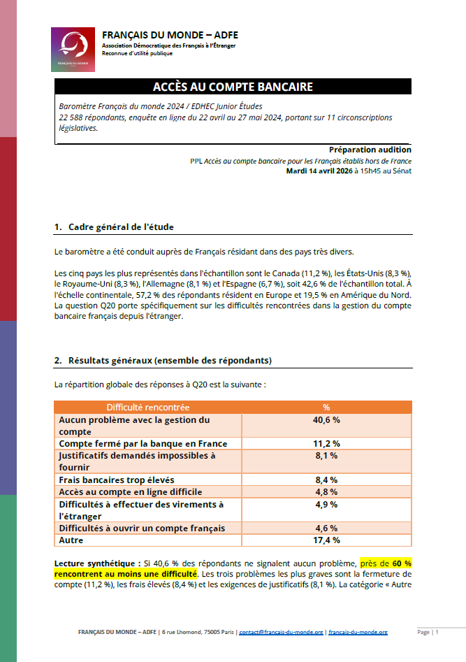Les données du Baromètre 2024 sont sans ambiguïté : l’accès au compte bancaire demeure un problème structurel pour les Français de l’étranger . En s’appuyant à la fois sur ces données et sur les témoignages de terrain, la proposition de loi entend franchir une étape décisive : faire du droit au compte non plus une promesse, mais une réalité effective pour tous les Français, où qu’ils vivent.